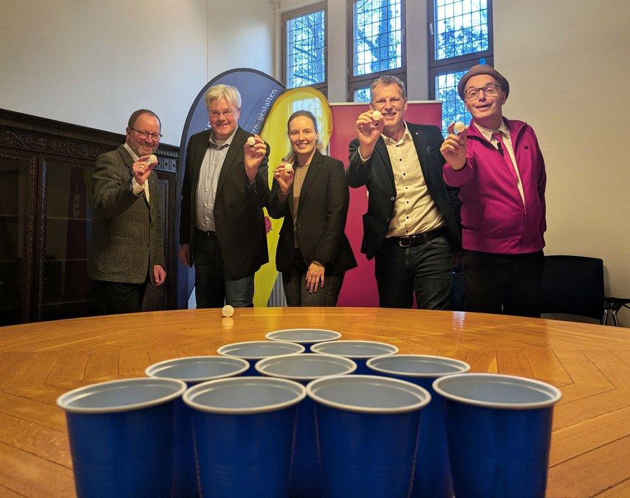 Gemeinsam mit den Sponsoren losten Jens Heuwinkel (r.) und Verbandsvorsteher Jörg Düning-Gast (l.) die Gewinner-Kitas mit einem Wurf von Pingpongbällen in vorbereitete Becher aus (v.l.): Holger Wehmeyer (Sparkasse Paderborn-Detmold-Höxter), Ilka Steinmetzler (Sparkasse Lemgo) und Jens Klusmeier (Lippische Landesbrandversicherung). Foto: LVL