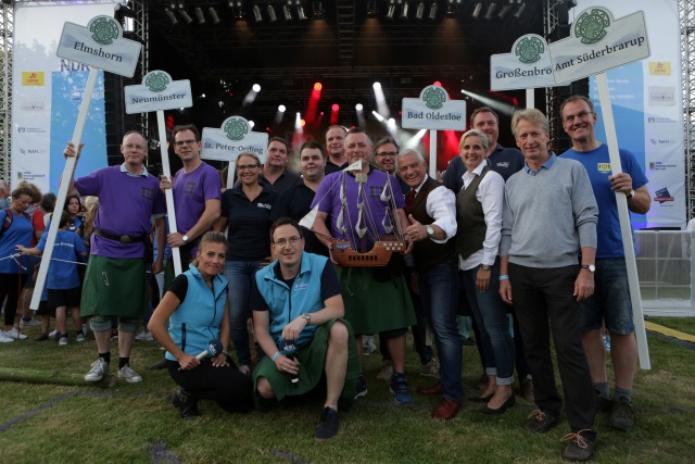 In einen Kilt gekleidet mussten Bürgermeister Jens Reise aus Großenbrode, Stadtrat Lars Bredemeier aus Elmshorn, Tourismusdirektorin Constanze Höfinghoff aus St. Peter-Ording, Oberbürgermeister Dr. Olaf Tauras aus Neumünster, Bürgermeister Jörg Lembke aus Bad Oldesloe und der Leiter des Amts Süderbrarup Thomas Detlefsen zunächst beim Tauziehen gegeneinander antreten. Unterstützung erhielten sie dabei von jeweils vier Mitspielern.