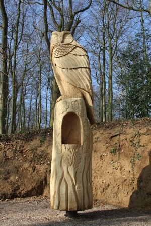 Ein überlebensgroßer Uhu sollte aus dem Stamm entstehen. Mit Landesverband – Forstwirt und Carving – Spezialist Sven Christiansen war schnell der Richtige gefunden, um mit kunstvollen Kettensägenschnitten aus dem Stamm den Eulenvogel und ein flämisches Fenster für die Urnen zu modellieren. Den Grobschnitt erledigte Sven Christiansen am liegenden Stamm, der dann mittels eines Frontladers zum Friedwald Kalletal transportiert wurde. Metallbauer Axel Nienstedt hatte hier einen rotierbareren Stahlfuß installiert, auf dem der Uhu jetzt sicher steht.