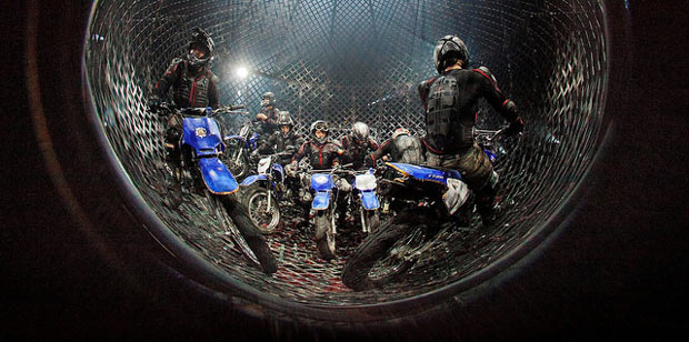 Sie treiben den Wahnsinn auf die Spitze. Das FlicFlac „must have“: 10 röhrende Motorräder fegen durch die Stahlkugel. 5 Meter Durchmesser, 10 Maschinen. Millimeterarbeit für die Fahrer. Lebensgefährlich. Hochspannung für die Zuschauer.