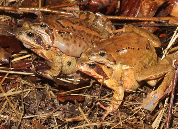 Häufig im „Doppelpack“ unterwegs: Grasfroschpärchen auf der Wanderung zum Laichgewässer. Foto: © Pressefoto: Deutsche Gesellschaft für Herpetologie und Terrarienkunde (DGHT)