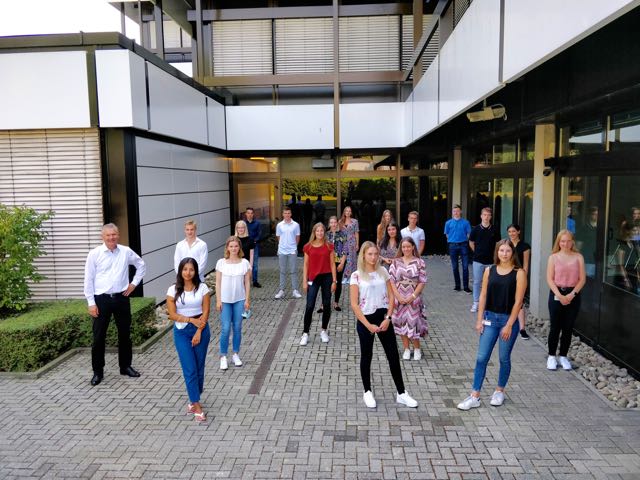 Klassenfoto der Industriekaufleute mit ihrem Lehrer Ernst Hermann Bedey unter Einhaltung von Hygiene- und Abstandsregelungen. Insgesamt haben 93 junge Frauen und Männer in dieser Woche ihre Ausbildung oder ihr duales Konzernstudium bei Bertelsmann begonnen. Foto: © Bertelsmann
