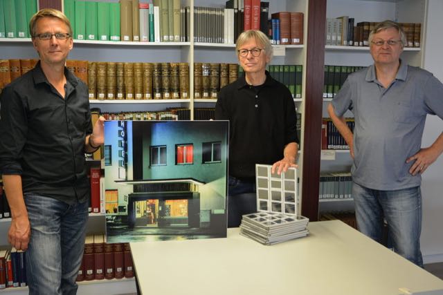 Kalle Noltenhans, Mitte, übergibt seine Dia-Aufnahmen an das Stadt- und Kreisarchiv Paderborn, ihm zur Seite rechts Wilhelm Grabe, Leiter des Stadt- und Kreisarchivs, und links Markus Runte, Kurator der Ausstellung im Stadtmuseum. Foto: © Stadt Paderborn