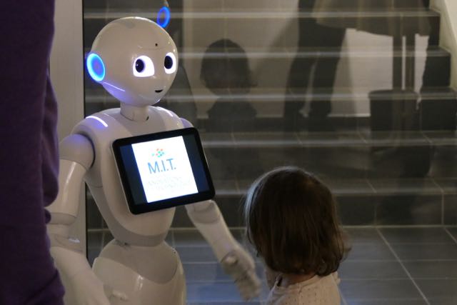 Ein besonderer Partygast war der Roboter Pepper. Er zog viele Blicke auf sich, denn er ist darauf programmiert Menschen und deren Mimik und Gestik zu analysieren und auf die Emotionszustände der Gäste zu reagieren. Ein kurzes Gespräch mit Pepper ist möglich, weil er auch Fragen nach dem Alter beantworten kann. Um das Thema Künstliche Intelligenz (KI) ging es im kurzen Impuls von Steffen Schiffel. Der Masterabsolvent der Fachhochschule Bielefeld und Doktorand machte deutlich, dass nur 40 Prozent der Start-up Unternehmen KI nutzen. Da ist noch „Luft nach oben“.