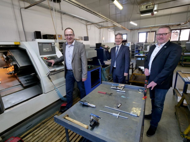 Firmenchef Michael Henkenjohann (l.) vor einer modernen CNC-Drehmaschine. Ihm schauen Bürgermeister Michael Berens, in der Hand eine Traverse für Werkzeuge, und Wirtschaftsförderer Thomas Westhof (r.) zu. Foto: Stadt Hoevelhof
