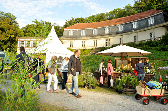 Im Eingangsbereich vor dem Krummen Haus breiten unter anderem Biogärtnereien ihre Pflanzen aus. Foto: LWL/Klein