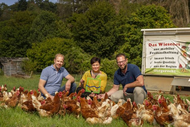 Zwischen den Hühnern: v.l.n.r. Karlheinz und Iris Spieker Siebrecht vom Buchenhof erhalten das Kulturland-Regionalmarken-Schild von Heiko Böddeker, Foto: Irina Jansen, GfW Höxter