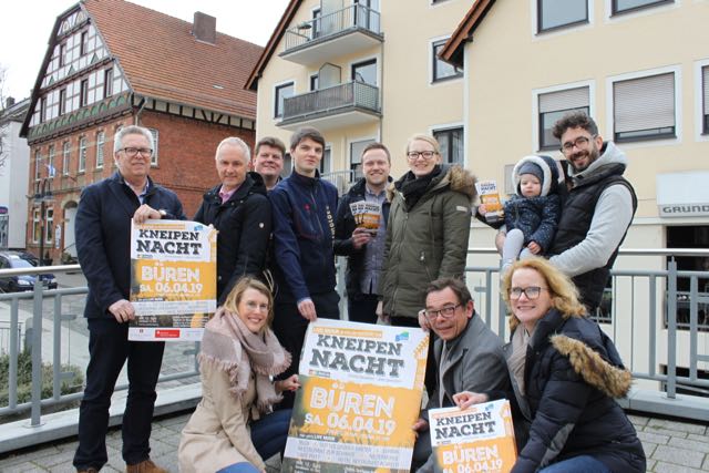 Musikalisch auf der Zielgeraden – Unterstützer und Wirte freuen sich gemeinsam mit Veranstalter Fabian Koch auf die Premiere der ersten Bürener Kneipennacht: (v.l. Bernd Köchling (Auto Köchling), Antonius Beiermann (Sparkasse Paderborn-Detmold), Judith Barwinsky (CAT marketing gmbh), Berthold Ackfeld (Hotel Ackfeld, Elias Kramps (Ibiza), Fabian Koch (OWL Booking), Vita Stolte (Restaurant Zur Schanze), René Klaas-Jung (FDP Büren), Marianne Witt-Stuhr (Leitung Stadtmarketing Büren) und Hendrik Stolte (Gottes Grüner Garten). Es fehlen Bärbel Olfermann (Kulturinitiative Niedermühle), Familie Koleventis (Sorbas) und Uwe Grewe (Cafe Pott).