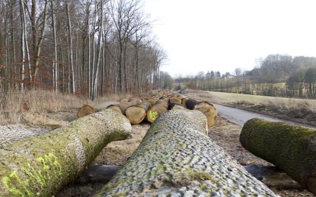 Wertholzstämme der Forstabteilung des Landesverbandes Lippe auf dem Holzlagerplatz am Entenkrug (Horn-Bad Meinberg/Belle).
