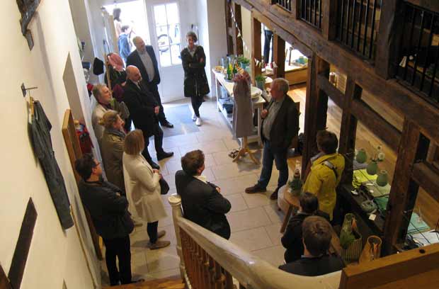 Dort begrüßte Reinhard Maas, der Geschäftsführer des Versand- und Einzelhändlers Maas Naturwaren. Er berichtete vom nunmehr über 30-jährigen Engagement des Ökotextil-Pioniers für eine nachhaltig kontrollierte Markt- und Lieferkette für ökologisch einwandfreie Produkte. Fairness und Miteinander prägten die Unternehmenskultur, das gelte für Partner in Anbau- und Produktionsländern ebenso für Mitarbeiterinnen und Mitarbeiter sowie die Umgebung des Unternehmens. So engagiere sich Maas Natur eigeninitiativ unter anderem mit dem Projekt „Brotzeit“ für Frühstücke in Grundschulen oder die Ausbildung von Näherinnen in Afrika. Die fachkundige Beantwortung kritischer Fragen zu Markt, Mitbewerbern und der Zukunft der nachhaltigen Produktion wurden auf einem kurzen Fußweg durch die Obernstraße in Richtung Alter Markt weiter diskutiert.