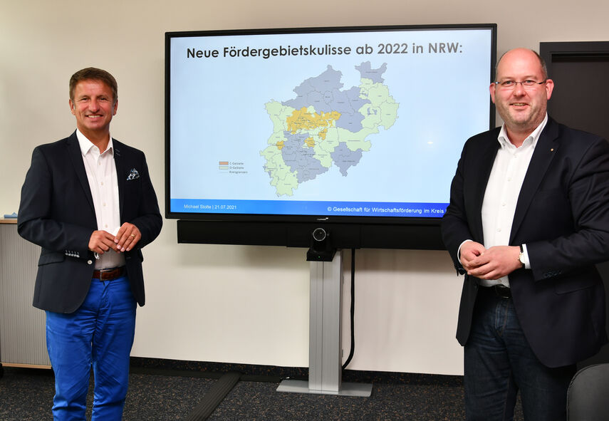 Große Freude bei Landrat Michael Stickeln (l.) und Michael Stolte (Geschäftsführer der GfW) darüber, dass der Kreis Höxter auch nach dem 01.01.2022 Fördergebiet der Gemeinschaftsaufgabe „Verbesserung der regionalen Wirtschaftsstruktur“ sein wird.Foto: Kreis Höxter