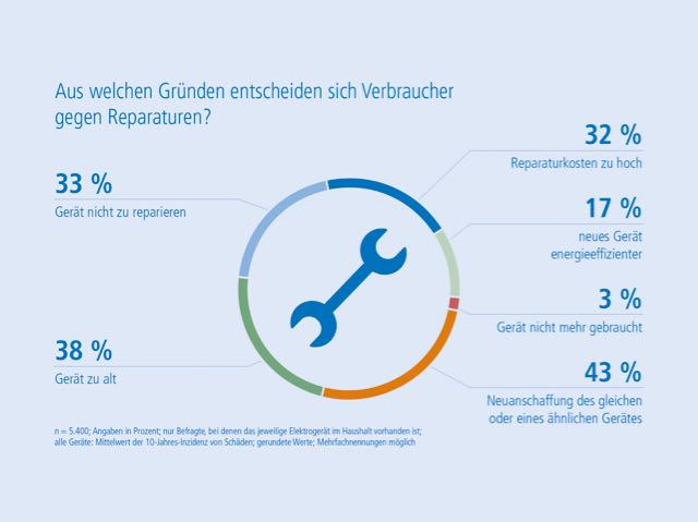 Weshalb entscheiden sich Verbraucher mehrheitlich gegen eine Reparatur defekter Geräte? Jeder Dritte bezeichnet zu hohe Reparaturkosten als ausschlaggebend, 43 Prozent nennen Neuanschaffungen als Grund gegen eine Reparatur.