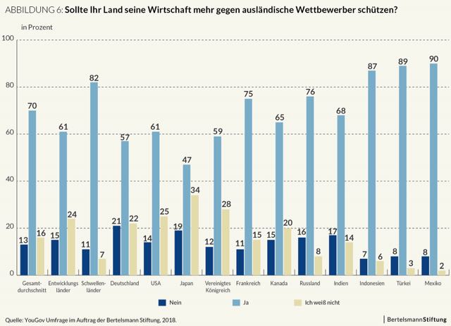 Grafik_Schutz_vor_auslaendischen_WettbewerbernInsgesamt sehen die Menschen in der weltweiten Vernetzung Vorteile für Wirtschaftswachstum und Lebensstandards. Gleichzeitig sind sie besorgt, dass Gehälter und sozialer Zusammenhalt unter Druck geraten könnten. „Die Menschen wünschen sich eine Globalisierung mit Sicherheitsgurt. Auf das Schutzbedürfnis der Bürger sollten Politik und Wirtschaft aber nicht mit protektionistischen Irrwegen reagieren. Globalisierung ist kein Schicksal, sondern ein Prozess, den wir gestalten können und müssen“, kommentiert Aart De Geus, Vorstandsvorsitzender der Bertelsmann Stiftung, die Ergebnisse der Umfrage.