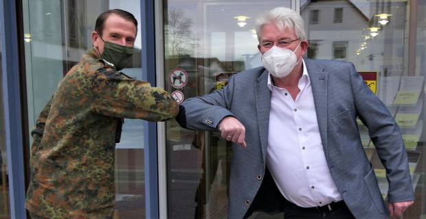 Bürgermeister Thomas Katzer und Brigadekommandeur Oberst Stephan Willer haben sich im Rathaus der Gemeinde Augustdorf zum gegenseitigen Kennenlernen getroffen. Willer folgte damit der Einladung des Bürgermeisters.