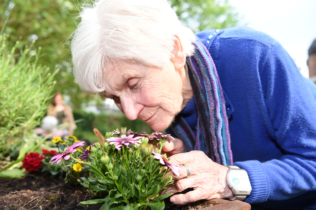 Eine Nase Blumenduft: Ingeborg Meyer genießt das Angebot Gartengruppe mit allen Sinnen.Foto: Johanneswerk / Christian Weische