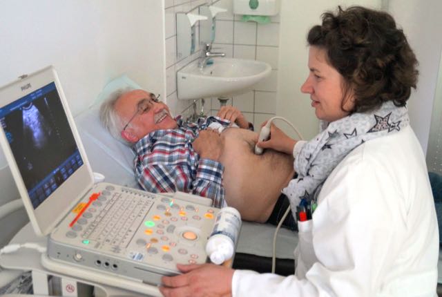 Mit einer Ultraschalluntersuchung kann ein Aneurysma frühzeitig erkannt und anschließend vorbeugende Maßnahmen ergriffen werden. Das Bild zeigt Chirurgin Dr. Edelgard Berger und Dieter Müller, der sich beim letzten Bauchaortenaneurysma-Screeningtag im Klinikum Gütersloh im vergangenen Jahr untersuchen ließ.