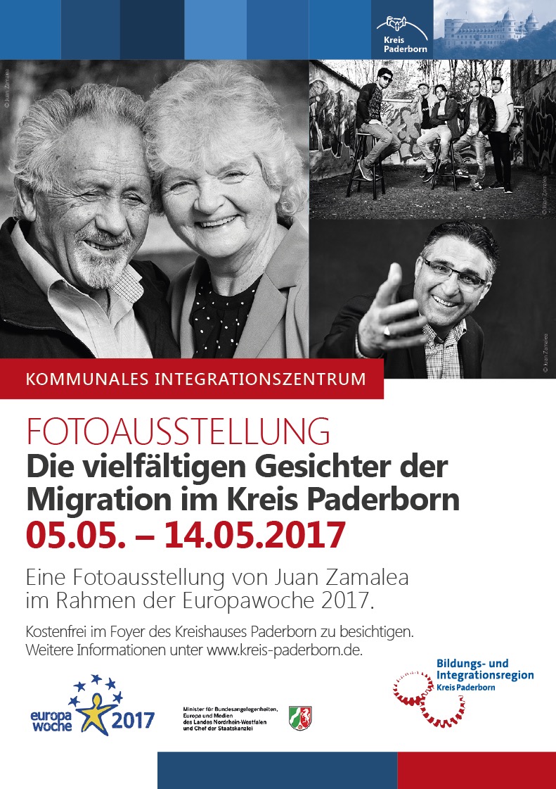 Kreis Paderborn. Das Ehepaar kam Mitte der sechziger Jahre als Gastarbeiter aus Griechenland nach Deutschland. Der junge Mann ist aus dem syrischen Aleppo geflüchtet und wünscht sich eine Zukunft mit Arbeit in Deutschland. Ihre Geschichten und viele weitere sind in der Fotoausstellung „Die vielfältigen Gesichter der Migration im Kreis Paderborn“ ab Freitag, 5. Mai, im Foyer des Paderborner Kreishauses, Aldegreverstraße 10 bis 14, zu erfahren. Die Ausstellung kann während der Öffnungszeiten der Verwaltung besucht werden: montags bis mittwochs von 8 bis 15.30 Uhr, donnerstags von 8 bis 18 Uhr und freitags von 8 bis 12 Uhr. Der Eintritt ist frei.