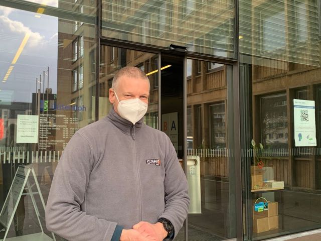 Gütersloh. „Hallo, haben Sie einen Termin?“ – so empfängt Martin Hollm, Mitarbeiter des Sicherheitsdienstes, der im Rathaus den Einlass kontrolliert, alle, die Zugang zum Rathaus wünschen. Aktuell kommen Bürger und Bürgerinnen nur mit Termin ins Rathaus. Der Sicherheitsdienst ist täglich mit mehreren Personen präsent, um den Einlass zu regeln. „Zunächst einmal achten wir derzeit natürlich darauf, dass die richtigen Masken, also eine so genannte OP-Maske oder FFP2, getragen wird“, so Hollm.