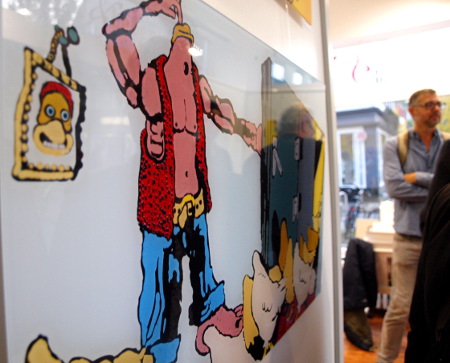 Eines der Bilder zeigt eine Figur, welche eine Tür öffnet und dort zahlreiche kopfloseOLYMPUS DIGITAL CAMERA Hühner hervorspringen: „Oft sagt man, wenn einem die eine Tür verschlossen wird, öffnet sich die nächste, doch was passiert, wenn aus dieser nichts sinnvolles zustande kommt?“ erklärt Peter Schnathorst. Die Realität kann bestürzend sein, doch der Künstler kreiert eine farbenfrohe und humorvolle Welt, in der man versinkt.