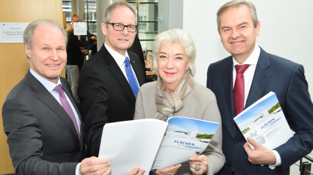 Fordern „Flächen für die Zukunft“: Thomas Niehoff, IHK-Hauptgeschäftsführer Ostwestfalen, Axel Martens, IHK-Hauptgeschäftsführer Lippe, Lena Strothmann, Präsidentin Handwerkskammer OWL, und Wolf D. Meier-Scheuven, IHK-Präsident Ostwestfalen (v.l.)