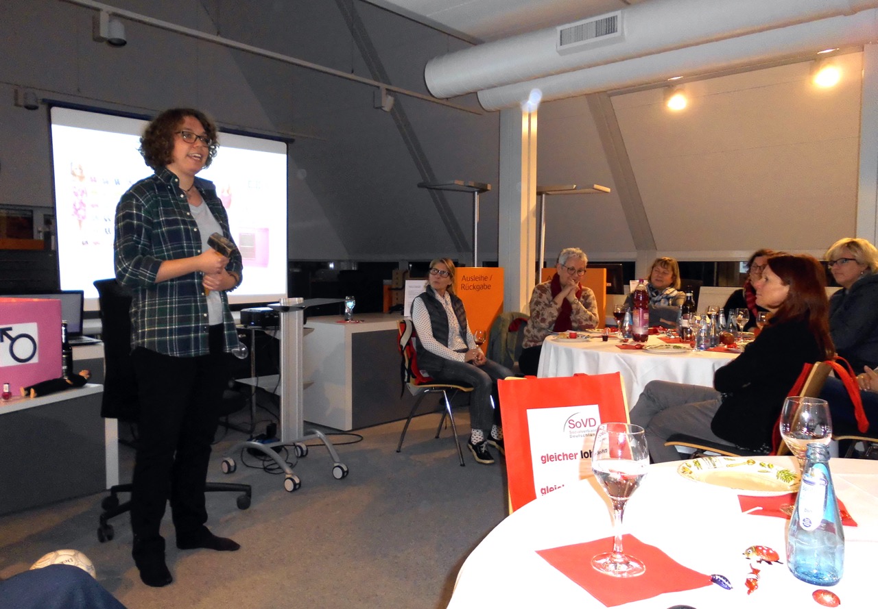 Deshalb, so die Gleichstellungsbeauftragte, waren Frauen und Männer eingeladen, sich mit der ungleichen Bezahlung von Frauen- und Männer-Berufen auseinander zusetzen. Referentin Lisa-Andrea Fischer aus Oldenburg fand mit dem Vortrag „Frühjahrsputz im Kopf“ ein interessiertes und diskussionsfreudiges Publikum. Die Referentin nahm die Besucherinnen in ihrem humorvollen Vortrag mit auf eine Reise durch die eigenen Schubladen im Kopf. Sie zeigte am praktischen Beispiel „Was hat jede Frau in ihrer Handtasche?“, dass dieses Schubladen-Denken täglich unbewusst praktiziert wird. Jeder Mensch braucht es, um überhaupt im eigenen Alltag zu bestehen. Aber hin- und wieder zu sich selbst auf Distanz zu gehen und sich zu fragen, warum denke und handle ich gerade so, kann hilfreich sein, so Fischer. Sie hinterfragte kritisch, wann eigentlich die geschlechterspezifische Erziehung anfängt, ob es überhaupt möglich ist, geschlechtsneutral zu erziehen. Ihr klares „Nein“ verbindet die Referentin aber mit der Hoffnung, dass Mädchen und Jungen so leben können, wie sie es sich wünschen. „Dass Frauen Hosen tragen, ist längst normal. Aber wie wäre es, wenn es auch normal wäre, dass Männer Röcke tragen? Und wäre es nicht richtig, wenn Jungen in der Grundschule auch die Farbe rosa lieben könnten, ohne dass sie dafür in eine Schublade gesteckt würden?“, fragt Fischer provokant.