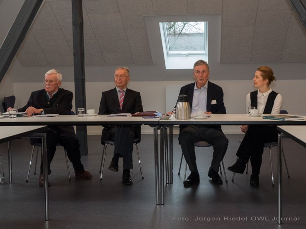 Fiebern der Eröffnung des Kunstforums Hermann Stenner in Bielefeld entgegen. Auf dem Foto v.l. Prof. Dr. Hermann-Josef Bunte (Rechtswissenschaftler und Kunstsammler) , Ortwin Goldbeck (Goldbeckstiftung), Dr. Werner Efing (Geschäftsführer) und Kunsthistorikerin Anna Maria Katz (Kuratorin). Foto: Jürgen Riedel