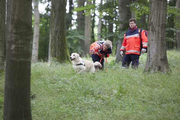 Bild 3: Daniela Bahn aus Paderborn schickt ihren Hund Baker auf die Suche nach Vermissten im Wald, ein weiterer Johanniter-Helfer steht mit einem Sanitätsrucksack zur ersten Hilfe bereit.