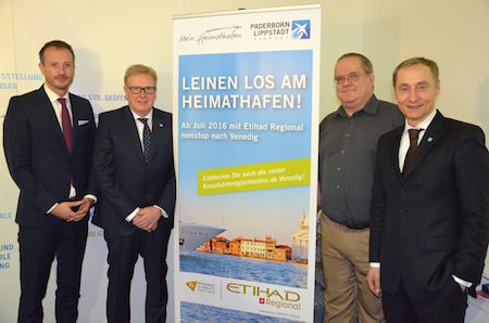Etihad Regional ab PADPaderborn. 29. März 2016 – Die Fluggesellschaft Etihad Regional verbindet den Paderborn – Lippstadt Airport ab Juli 2016 mit der Hafenstadt Venedig. Damit besteht erstmals ein direkter Anschluss vom Heimathafen an die italienische Lagunenstadt. Das neue Angebot ist für Kreuzfahrttouristen attraktiv, denn Venedig ist Ausgangspunkt zahlreicher Kreuzfahrten in das Mittelmeer und sogar nach Südafrika. Venedig ist das erste italienische Ziel ab Paderborn – Lippstadt.