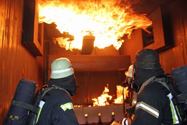 Der Unterschied zum echten Feuer: Die Temperaturen sind noch höher – bis 1000 Grad Celsius und jeder Fehler kann zu Verletzungen führen oder sogar tödlich sein. In der gesicherten Übungsanlage haben die Feuerwehrmänner jederzeit die Möglichkeit, einen Notausschalter zu drücken. Zusätzlich überwacht ein zweiter Kreisausbilder im Kontrollraum der Brandsimulationsanlage das Geschehen.Der Angriffstrupp arbeitet sich an den Brandherd heran. Alle Löschversuche verlaufen ohne Erfolg. Die Wärme staut sich immer mehr im Raum. Ein Rauchabzug kann nicht geschaffen werden. Die Temperatur steigt weiter an. Pyrolysegase entstehen. Durch die offene Tür kann weiter Sauerstoff in den Raum nachströmen. Plötzlich kommt es zur gefährlichen Rauchgasdurchzündung, dem „Flash Over“. Der Brand breitet sich schlagartig im ganzen Raum aus.