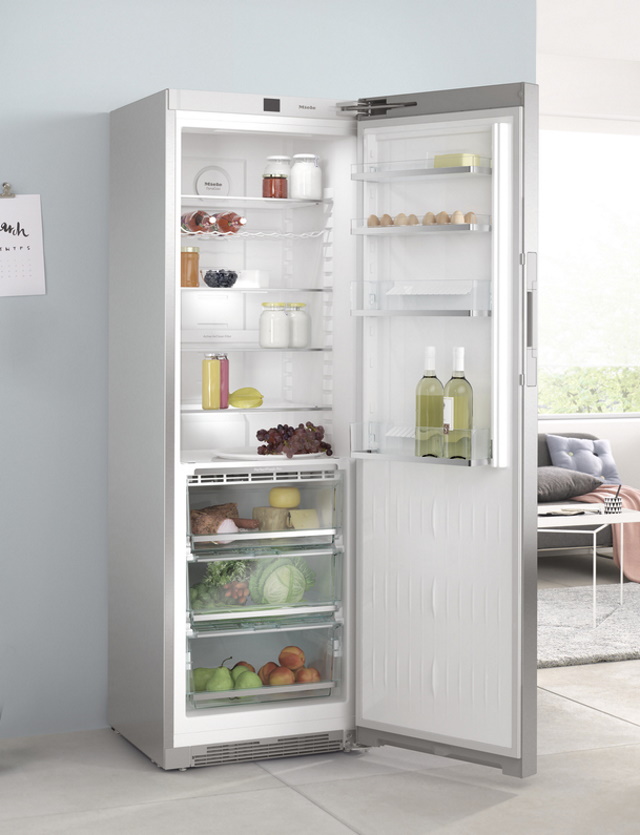 Zur gründlichen Reinigung reicht es, das Innere des Kühlgeräts mit Wasser und Spülmittel auszuwischen. Praktisch: Bei Miele-Geräten sind viele herausnehmbare Teile für den Geschirrspüler geeignet. Für die Türdichtungen eignet sich besonders Schmierseife oder ein sanfter Haushaltsreiniger. Keinesfalls sollte man Essig verwenden. Das althergebrachte Hausmittel wirkt zwar desinfizierend, greift aber Kunststoff und Dichtungen an. Und sind die Dichtungen beschädigt, können sie ihre Aufgabe nicht mehr ausreichend erfüllen, den Luftaustausch zu unterbinden. Die Folge: ein höherer Stromverbrauch, damit die Kühltemperatur gehalten wird.