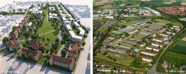 Das Alanbrooke-Quartier (Visualisierung links) hat den A-Status im Rahmen der REGIONALE 2022 erhalten, während das Zukunftsquartier (Luftbild links) einen großen Schritt weitergekommen ist und mit dem B-Status ausgezeichnet wurde.Foto:© Stadt Paderborn