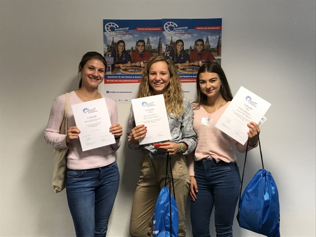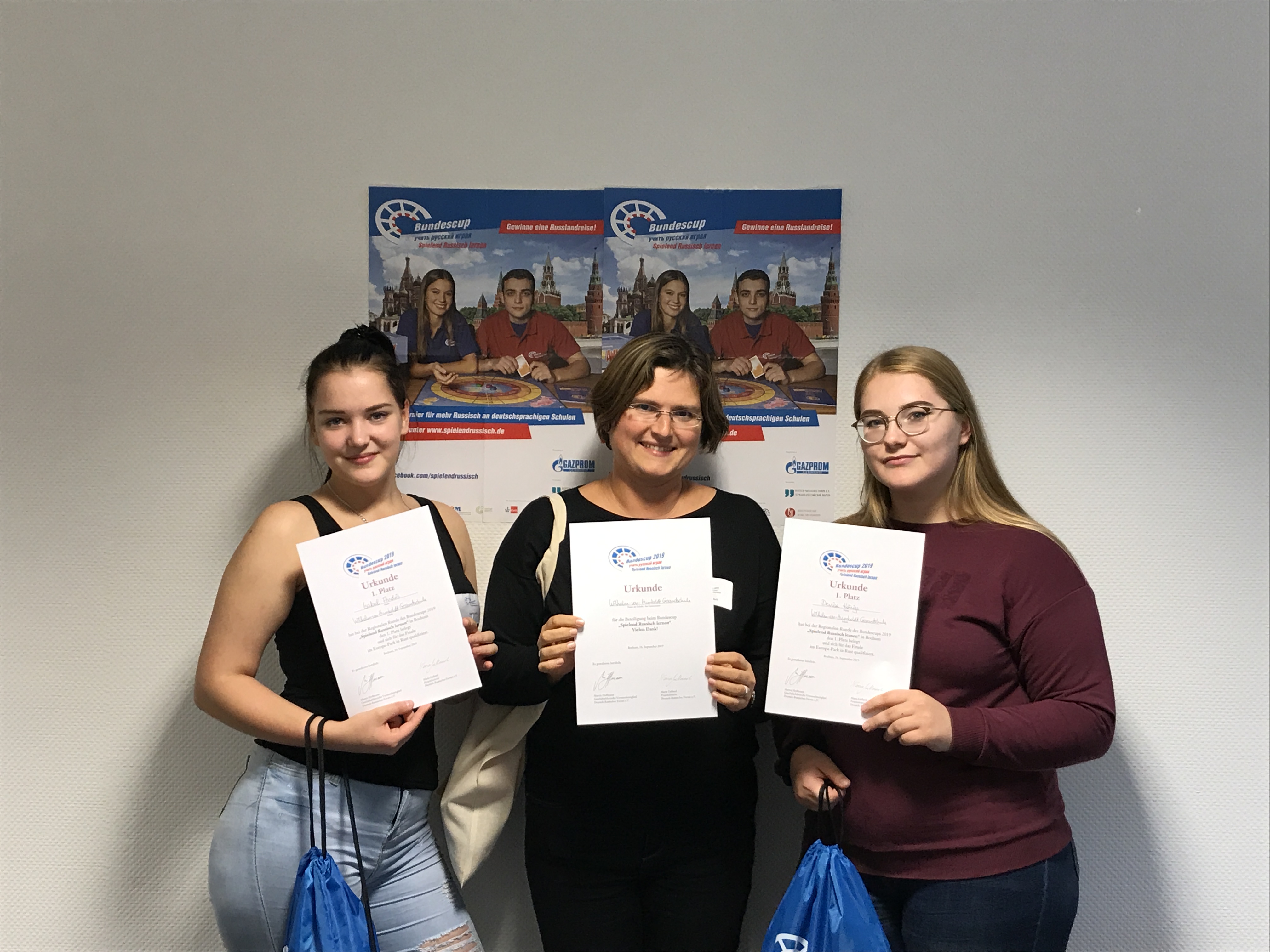 Isabel Andris und Denise Königs vonder Wilhelm-von-Humboldt Gesamtschule in Grevenbroich haben die Regionalrunde des Bundescups „Spielend Russisch lernen” am Landesspracheninstitut in der Ruhr-Universität Bochum gewonnen. Die beiden 16-jährigen Gymnasiastinnen verwiesen in einem spannenden Finale Tim Gloger und Maxim Kusmin vom Städtischen Gymnasium Bergkamen auf den zweiten Platz. Bronze holten bei der ersten von insgesamt drei NRW-Runden Jonna Gronemeier und Christine Heidenreich vom Immanuel-Kant-Gymnasium Bad Oeynhausen. Auf Platz vier landete das Team aus Ennepetal: Ronja Inge Fabry und Annalena Kartenberg vom Reichenbach-Gymnasium.