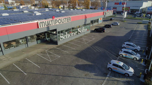 mit Sonnenstrom aufladen. Die WestfalenWIND Gruppe hat auf den Parkplätzen des Möbelhauses „Multipolster“ und der „Weinstraße Köster“ insgesamt 8 Lademöglichkeiten für Elektrofahrzeuge aufgebaut. E-Autos können dort mit einer Leistung von bis zu 22 Kilowatt innerhalb einer Stunde gut 100 Kilometer Fahrleistung nachtanken. Gespeist werden die Ladepunkte durch eine 550 KW große Solarstromanlage auf dem Dach von Multipolster, die ebenfalls von WestfalenWIND betrieben wird.