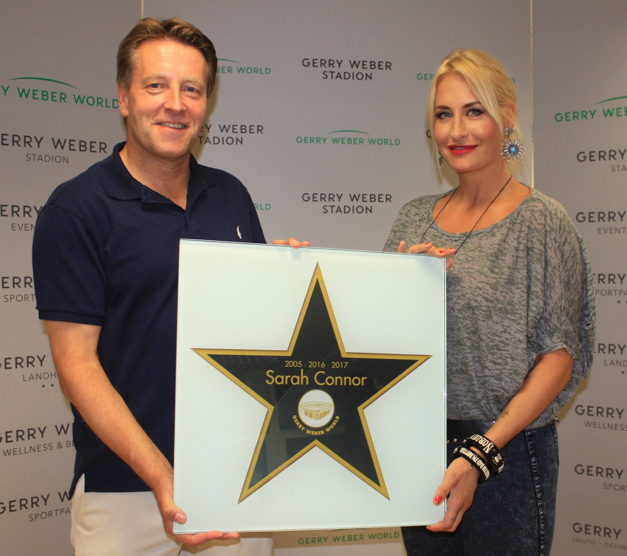 HalleWestfalen. Partystimmung und Gänsehaut-Momente garantieren die Live-Konzerte von Sarah Connor auf ihrer Tournee >Muttersprache – Live<. In den großen Konzertarenen begeistert die Pop-Queen mit ihrer Hammerstimme das Publikum und so rockte sie im vergangenen Jahr (22. April 2016) auch das GERRY WEBER STADION vor 7.500 und am vergangenen Freitag (07. Juli) vor 6.300 Fans. Für ihre begeisternden Live-Acts erhielt Connor bereits den >Sold Out<-Award. Nun wurde der Soulstimme eine weitere Ehre zuteil. Die gebürtige Delmenhorsterin erhielt von Ralf Weber (CEO GERRY WEBER WORLD) vor ihrem Auftritt in der ostwestfälischen Eventarena den >Walk of Fame-Stern< am 07. Juli 2017.