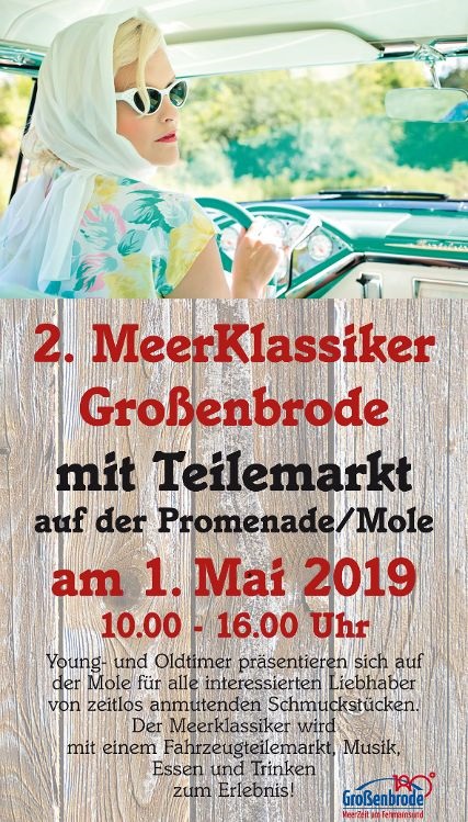 Großenbrode. Mittwoch, 01.05.2019:  10.00 – 16.00 Uhr 2. MeerKlassiker mit Young- & Oldtimern an der Mole Großenbrode. Young- und Oldtimer präsentieren sich in Großenbrode am 01. Mai in der Zeit von 10.00 bis 16.00 Uhr für alle interessierten Auto-Liebhaber von zeitlos anmutenden Schmuckstücken. Der MeerKlassiker wird mit einem Fahrzeugteilemarkt,