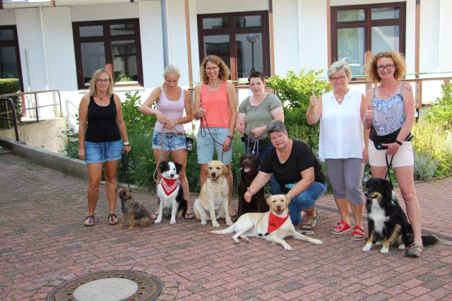 Susanne Tingelhoff, zweite von rechts, zeigt den Daumen hoch für sechs neue Therapiehunde-Teams (von links): Katharina Sommerburg mit Lenni, Jacky Brocherseifer mit Mira, Anne Brinkmann mit Bo, Michaela Boje mit Boerne, Ulrike Saggel mit Ella, Trainerin Susanne Tingelhoff und Agnes Pryczko mit Thor, Foto: Gräfliche Kliniken