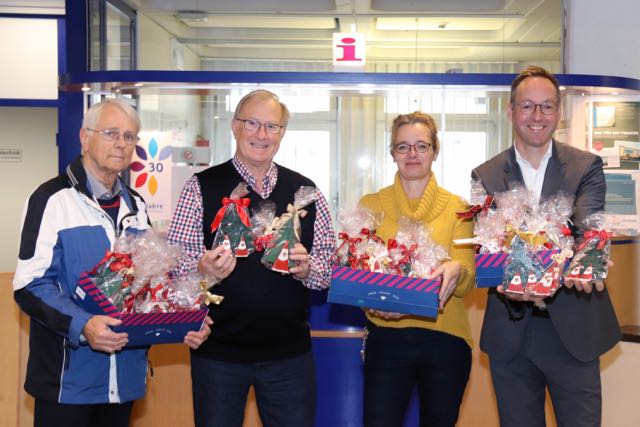 Heinz Schulte (2.v.l.) verteilt seine Nikoläuse an Dr. Wennemar Schweer (l.), der sie während des Adventskrämchen verkaufen wird, und Bürgermeister Theo Mettenborg (r.) sowie Rathaus-Mitarbeiterin Elke Reinhardt, die die Nikoläuse an der Infotheke im Rathausfoyer bereithält.