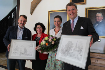 All diese Zeichnungen dekorieren nun einen Raum des Hauses Kirchstraße 21, in dem die Stadt Gütersloh ihre Gäste empfängt und in dem glückliche Paare getraut werden. Daran erinnerten sich auch Reinhard Zinkann und seine Frau Amelie gern, als sie die Bilder nun symbolisch an Bürgermeisterin Maria Unger und Stadtarchivar Stephan Grimm übergaben. Maria Unger hob in ihrem Dankeschön die besondere Verbundenheit der Familie Zinkann hervor, zu der bekanntlich auch Dr. Peter Zinkann als Gütersloher Ehrenbürger und seine Frau Dr. Karin Zinkann zählen: „Es ist schön, mit diesem Geschenk bestätigt zu bekommen, dass Sie an Ihre Heimatstadt Gütersloh denken und dass Ihnen das Haus Kirchstraße 21 besonders am Herzen liegt.“