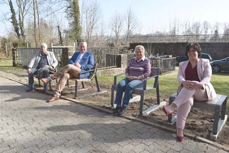 Höxteranerin Frau Luttmann (2.v.r.) und Höxteraner Herr Schulz (links) testen mit Bürgermeister Daniel Hartmann und Baudezernentin und Landesgartenschau-Geschäftsführerin Claudia Koch die neuen Sitzmöbel. Foto: Stadt Höxter