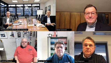 Berichteten über ihre Erfahrungen im Lockdown, Corona-Hilfen, Öffnungsperspektiven und Insolvenzgefahr: Harald Grefe, Wolf D. Meier-Scheuven, Rainer Schorcht, Olaf Stegmann, Rainer Döring und Andreas Büscher (von links oben im Uhrzeigersinn). Foto: IHK Ostwestfalen