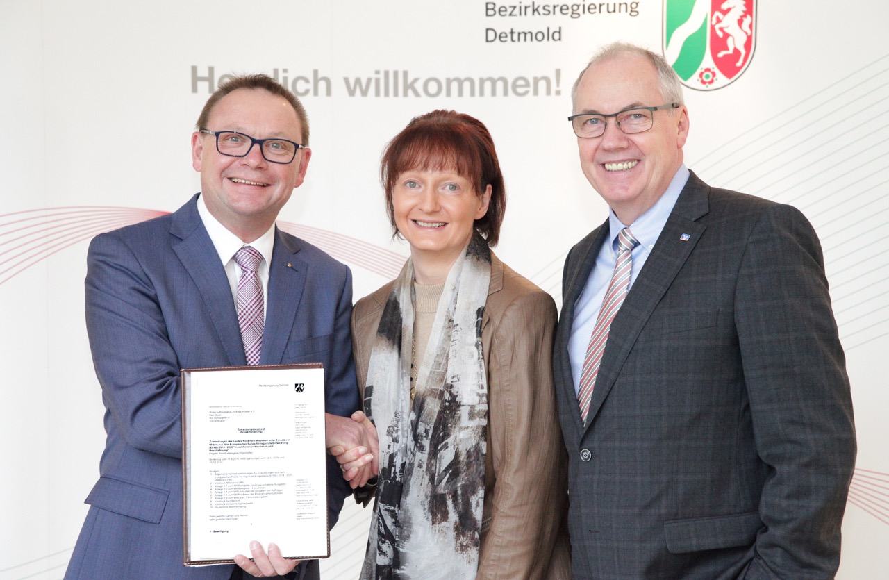 WIH-Vorstandsvorsitzender Jürgen Spier (links) nimmt den Bewilligungsbescheid über die Förderung von 15.500 Euro von Abteilungsleiterin Anke Recklies (Bezirksregierung) im Beisein von Paul Löneke, Vorstandsvorsitzender der Vereinigten Volksbanken e.G., entgegen.