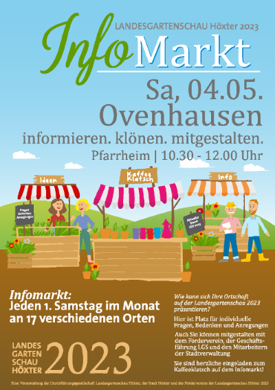 An dieser Informationsveranstaltung, inmitten eines Marktes werden den Gästen und Mitwirkenden Raum für Ideen, Fragen, Anregungen und auch Bedenken gestellt. Der Infomarkt ist ein Bummel durch das Projekt Landesgartenschau in Höxter 2023. Wie bei einem Besuch auf dem Wochenmarkt: Jeder ist herzlich eingeladen zum Kaffeeklatsch. Uhrzeit: Jeweils 10.30-12.00 Uhr, Die Orte: