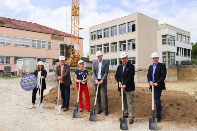 Spatenstich für den drei geschossigen Anbau am Bildungszentrum Weser-Egge (von links): Katharina Neubert (Regionale 2022), Christian Jostes (KHWE-Geschäftsführer), Ute Pägel (Leitung Bildungszentrum Weser-Egge), Marcel Giefers (Verwaltungsratsvorsitzender), Hermann Temme (Bürgermeister Brakel) und Rainer Krekeler (Architekt).