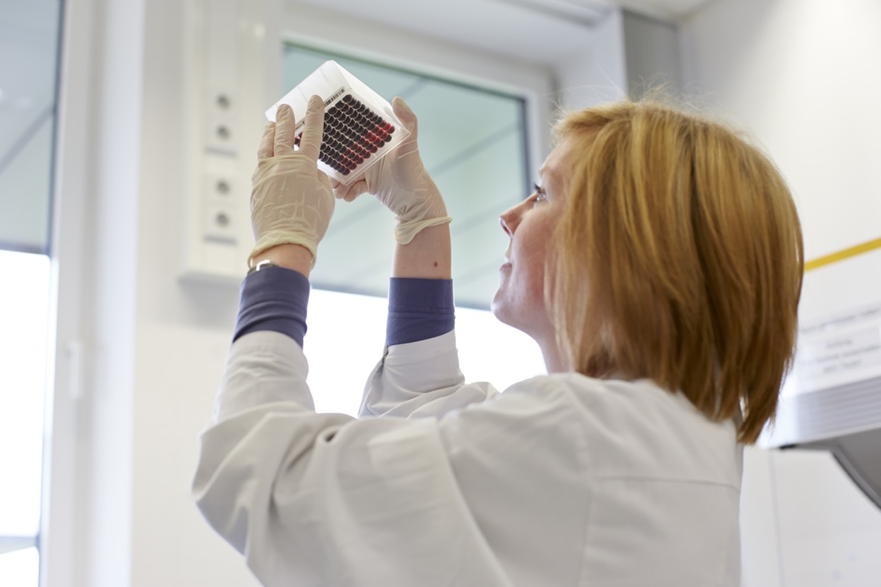 13_MG_9599_ Im DKMS Life Science Lab prÅft eine Mitarbeiterin ein vorbreitetes Blutprobenpanel auf den korrekten FÅllstand (1)Hövelhof/Minden. Der 7-jährige Janno aus Minden hat Blutkrebs. Für viele Patienten ist die Stammzellspende die einzige Überlebenschance. Um allen Patienten weltweit zu helfen, kann jeder, der gesund und zwischen 17 und 55 Jahre alt ist, helfen und sich am Freitag, den 31.03.2017, in der Aula des Weser-Kollegs in Minden als potenzieller Stammzellspender bei der DKMS registrieren lassen. Mindens Bürgermeister Michael Jäcke unterstützt als Schirmherr die Aktion. Auch Geldspenden werden dringend benötigt, da der gemeinnützigen Gesellschaft allein für die Registrierung eines jeden neuen Spenders Kosten in Höhe von 40 Euro entstehen.