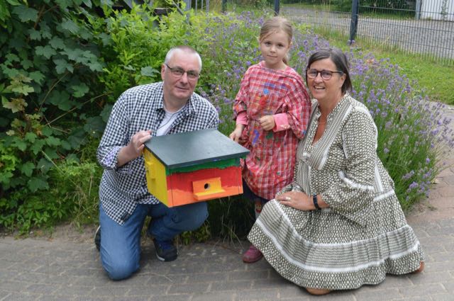 Ein besonderer Auftrag kam von der Lemgoer Ortsgruppe im Bund für Umwelt und Naturschutz Deutschland. In der Streuobstwiese am Lindenhaus soll zur erneuerten Wildbienenwand auch wieder ein Hummelhaus kommen. Das haben die Kinder nun mit Begeisterung angemalt. Gruppenleiterin Petra Kammler, Kinderhausleiter Jürgen Tank und Lisa – stellvertretend für die das Kindermalteam, präsentieren sie das Ergebnis und hoffen, dass es den Hummeln gefallen wird. Als kleines Dankeschön gibt es vom Bund Lemgo einen Vogelnistkasten, Blühwiesensamen und Infos zum Wildbienenschutz. Informationen und beispielhafte Maßnahmen zum Thema Hummel- und Wildbienenschutz findet man auch im Internet unter: https://www.bund-lemgo.de/Wildbienen_schuetzen.html