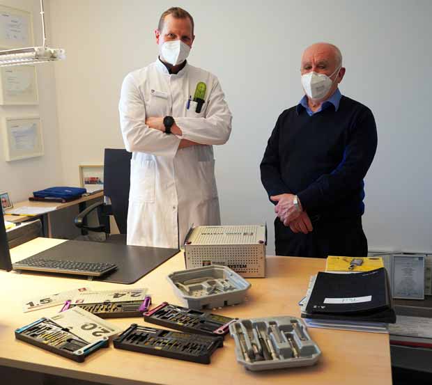 Dr. Philipp Bula (links) übergibt das OP-Set an Dr. Eugen Klein