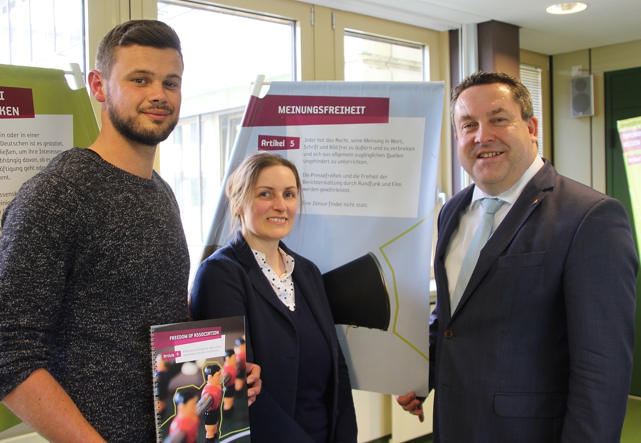 Laden insbesondere Schüler und Lehrer dazu ein, die verschiedenen Dimensionen von Freiheit im deutschen Grundgesetz zu entdecken: Thomas Frank und Mirjam Mann, beide Mitarbeiter des KI, sowie Landrat Dr. Axel Lehmann (von links).