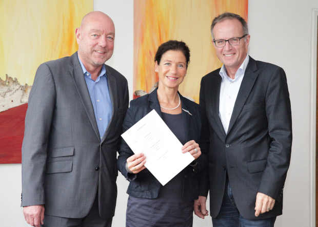 Dr. Ulrich Voigt (links), Vorsitzender des Bildungsnetz Förderung:Individuell, Barbara Manschmidt, Geschäftsführerin des Stiftungsbereichs Schulen der v. Bodelschwinghsche Stiftungen Bethel, und Michael Uhlich, Leiter der Abteilung Schule der Bezirksregierung Detmold, vereinbarten die Fortführung der Internetschulen. © Bezirksregierung Detmold