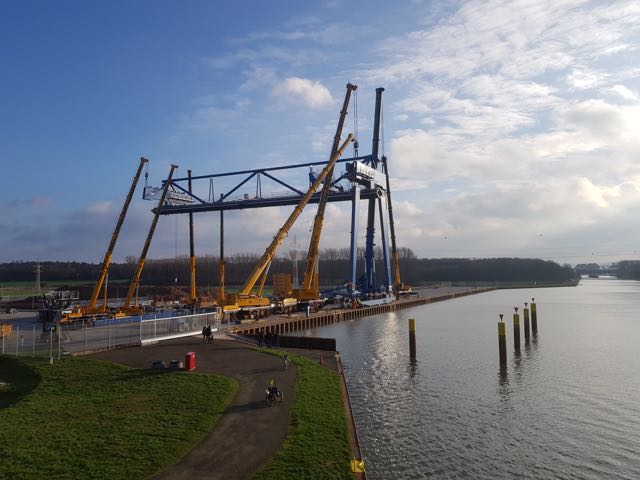 Minden. Der RegioPort Weser nimmt weiter Formen an. Für den neuen Containerhafen am Mittellandkanal wird in diesen Tagen die große Kranbrücke aufgestellt, die zunächst vormontiert wurde. Die Arbeiten haben begonnen und werden an den beiden Folgentagen fortgesetzt, teilt der Geschäftsführer der Mindener Hafen GmbH, Joachim Schmidt, mit. Damit werde die neue Hafenanlage weithin sichtbar sein. Die Hafen GmbH plant, das neue Terminal mit der Krananlage und Abstellflächen für Container Anfang April 2019 in Betrieb zu nehmen (1. Teilbauabschnitt).