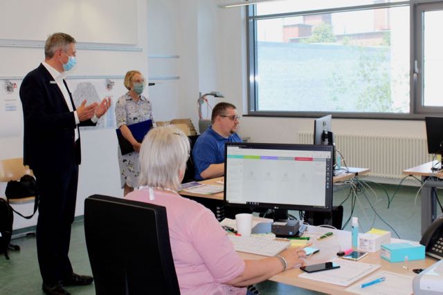 „Vom Lagezentrum aus bündeln wir die Schnittstellen zum Kreis Gütersloh, zur Polizei, zur Bundeswehr sowie zum Deutschen Roten Kreuz und koordinieren die Bedarfe der unter Quarantäne stehenden Menschen“, erklärt Christine Lang, als Erste Beigeordnete der Stadt Gütersloh auch für den Bereich Ordnung zuständig. In der Zentrale, als sogenanntes Back-Office, läuft alles digital ab: Für den koordinativen Aufwand der Meldungen aus den 15 Teams hat die Stadt Gütersloh eigens ein EDV-Tool entwickelt. „Die Bedarfe können damit Objekt- und Personenbezogen bei den Menschen vor Ort eingetragen werden“, erklärt Carsten Schlepphorst, Leiter des städtischen Fachbereichs Ordnung und Personal. „In Echtzeit kann dann das Team im Lagezentrum die Bedarfe ermitteln und an das Deutschen Roten Kreuz weitergeben.“ Mehr als 100 Mitarbeiterinnen und Mitarbeiter der Stadtverwaltung unterstützen im Wechsel derzeit das Lagezentrum unter der Leitung von Nicole Pollklas, darunter und bei den Teams sind Verwaltungskräfte aus ganz unterschiedlichen Bereichen. Schulz, Lang und Schlepphorst dankten für den Einsatz und die Unterstützung durch die Polizei in einer „außergewöhnlichen Situation, die uns vor bisher nie dagewesene große Herausforderungen stellt.“